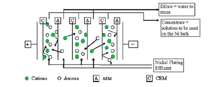 Electrodialysis Stacks for cost effective recovery and reuse of nickel electroplating solutions from Bright Nickel electroplating effluent are available. Electrodialysis is a clean technique able to produce dilute and concentrated solutions from a contaminated started solution.